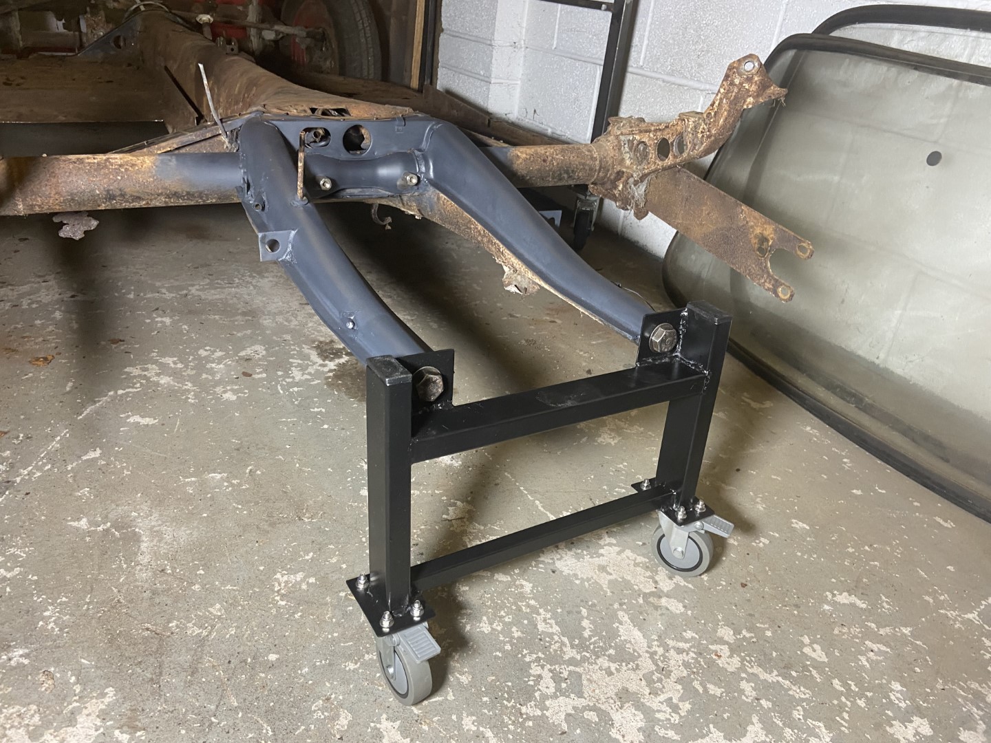 Turning my attention to the floorpan, I fabricated a stand (again on casters) which could be bolted to the frameworks. Although this works fine, I think I am actually going to make another pair of caster stands that bolts to where the spring plate covers mount at a later date so that it allows me to fit the gearbox and work on that area easily.