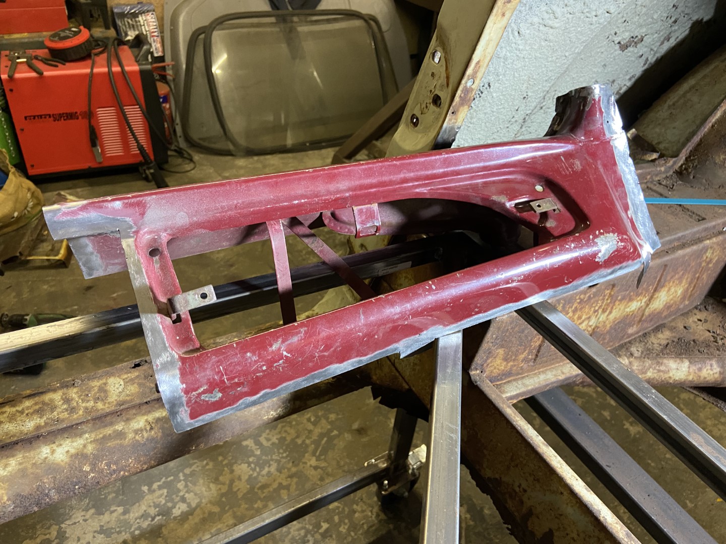 However, before I welded the dash in, I had to do a small repair on the window lip. This piece has a slight cure in it, so I used my shrinker stretcher tool to make a new piece to be welded in. Excuse the sh*t welding (it is solid), I have a new welder and it took me a while to get it set right, as well as for me getting used to welding to old thin car metal!!