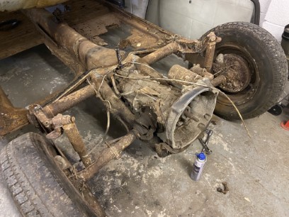 Note the one year only (1960) gearbox mount arrangement which consists of a pair of studs mounted directly to the torsion tube (these are covered by rubber glove tips in the photo!!). I’m still not sure what I am going to do about this as the one year only mount is super hard to find/ and there is no uprated version of these. I might weld on a later mount or fabricate my own 'intermediate plate' that takes a later mount. We’ll see……